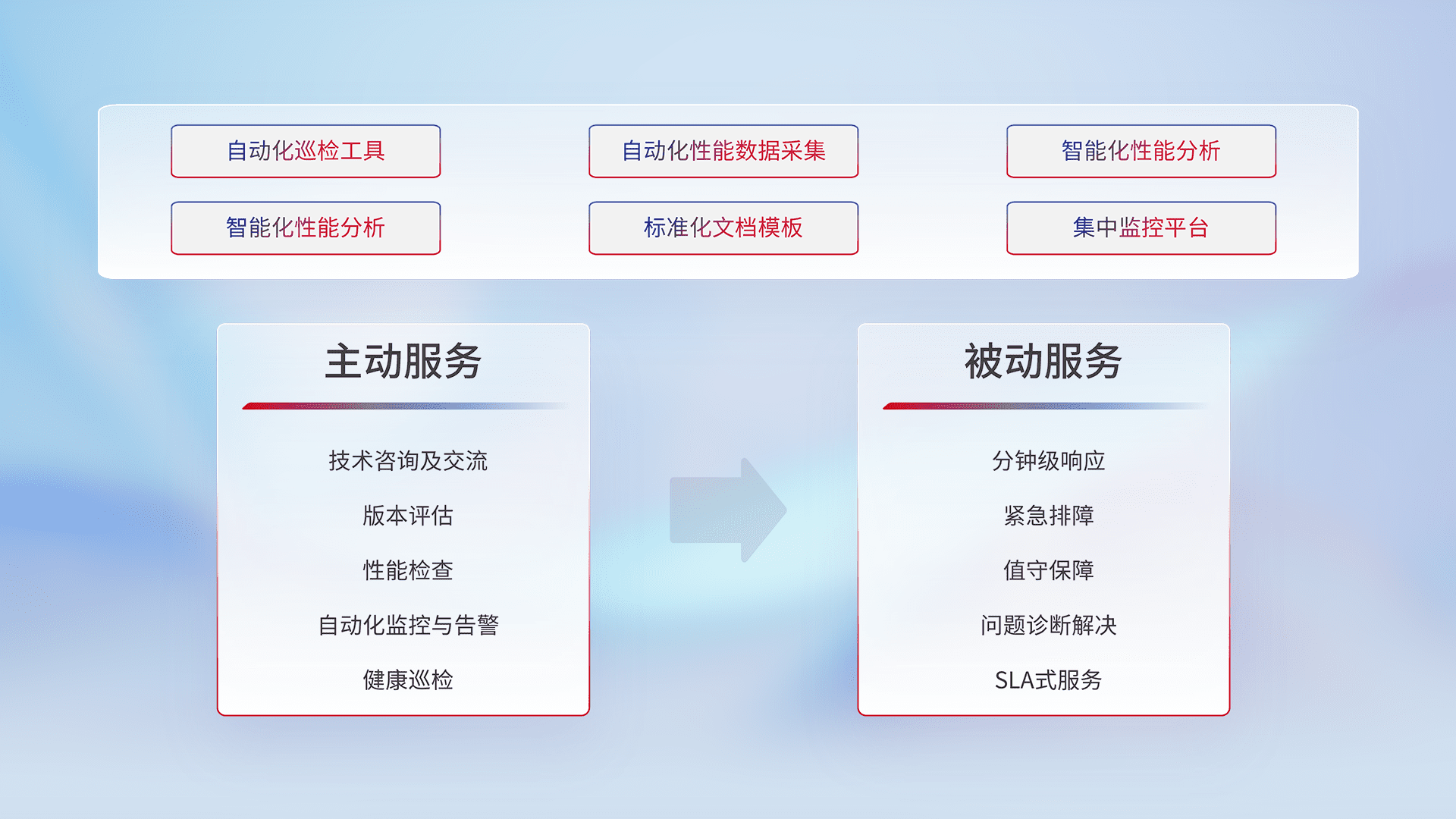 智能化工具和标准化文档,,,保障服务质量,,,提供主动服务(包含技术咨询、、、版本评估、、、、性能检查、、自动化监控与告警、、、、健康巡检)和被动服务包含(分钟级响应、、、、紧急排障、、、值守保障、、、问题诊断解决、、SLA服务)。。。。