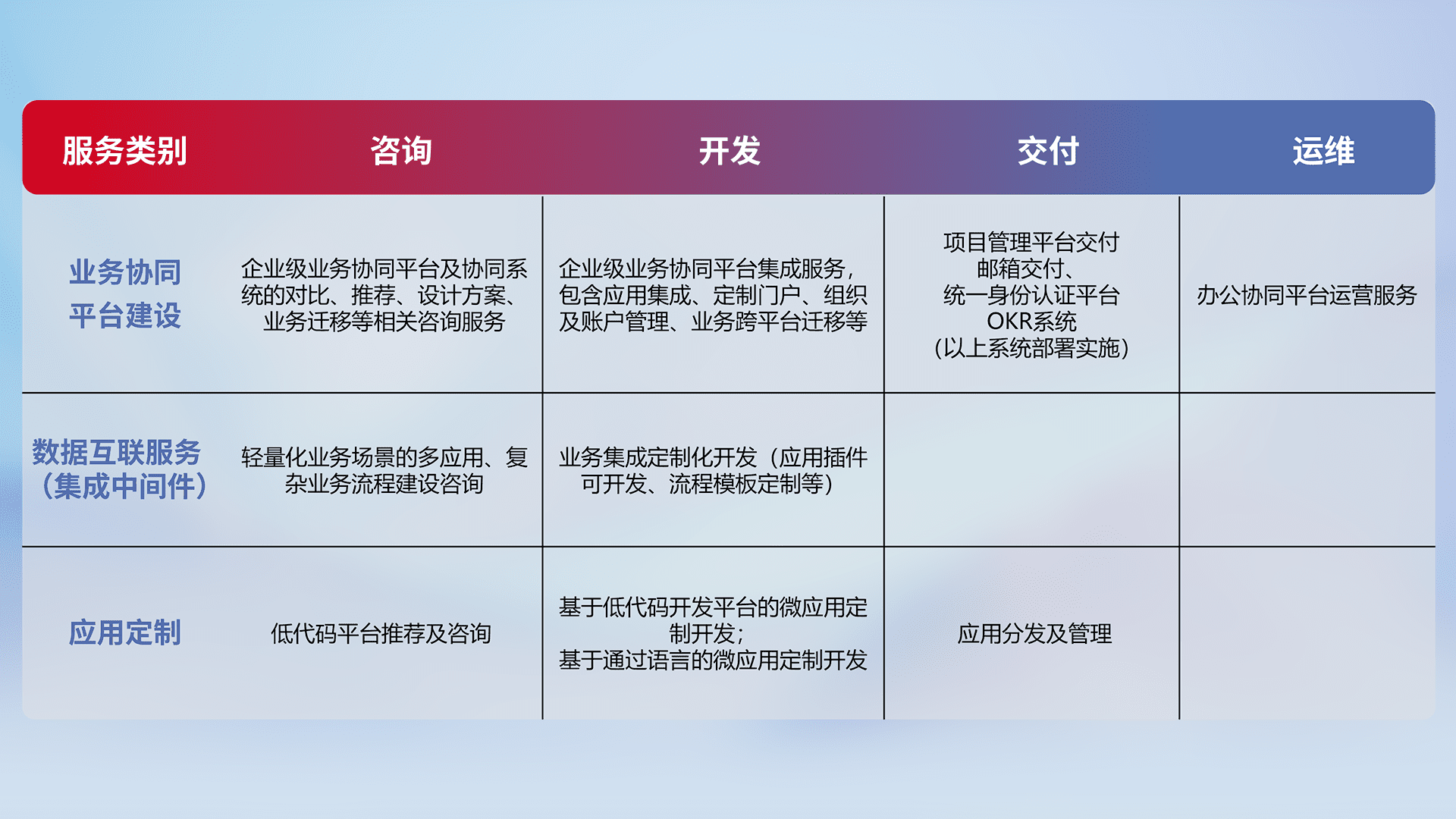 针对钉钉、、、企微、、IDaas等平台级产品提供产品的规划、、方案、、、、交付、、、定制化开发等服务,,,,实现如统一协同办公、、、、智能客户服务、、、、混合会议管理、、、、智能数据查询、、等业务场景,,,实现数字化转型。。